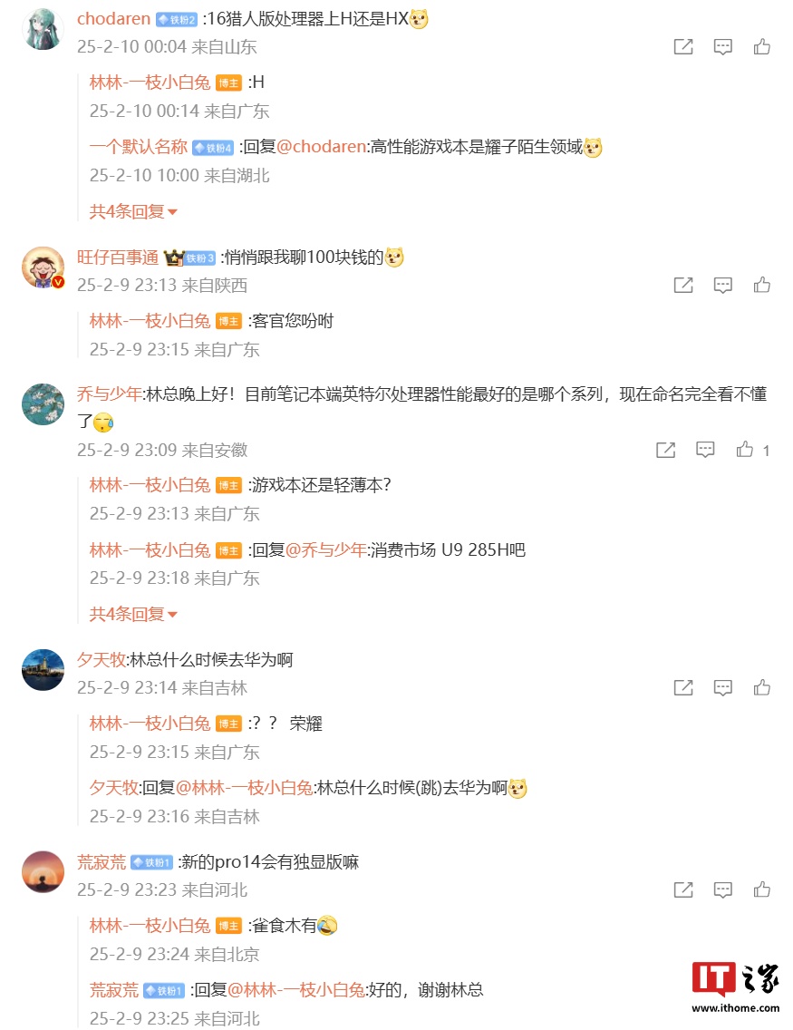 IT之家注意到,林林在昨日晚发布的微博评论区中与网友展开互动,并透露了新品部分细节:针对 MagicBook Pro 14 笔记本是否会推出“独显版”,他表示“雀食木有”;针对 16 猎人版处理器上 H 还是 HX,他回复“H”。