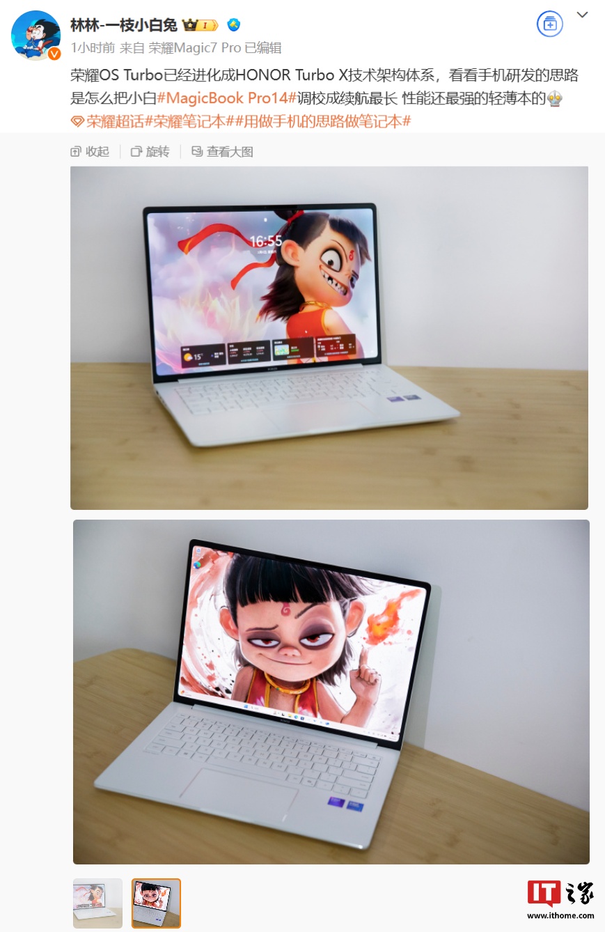 有爆料称,荣耀 MagicBook Pro 14 笔记本将于本月底发布,新品主打纯白配色,号称是“最轻薄性能本”,机身整体重量 1.3 kg、厚度 15.9mm。另外,新笔记本将搭载 3.1K 绿洲护眼屏,提供专业色彩显示管理;全系配备新酷睿 Ultra 200H 系列处理器 + Turbo 技术。
