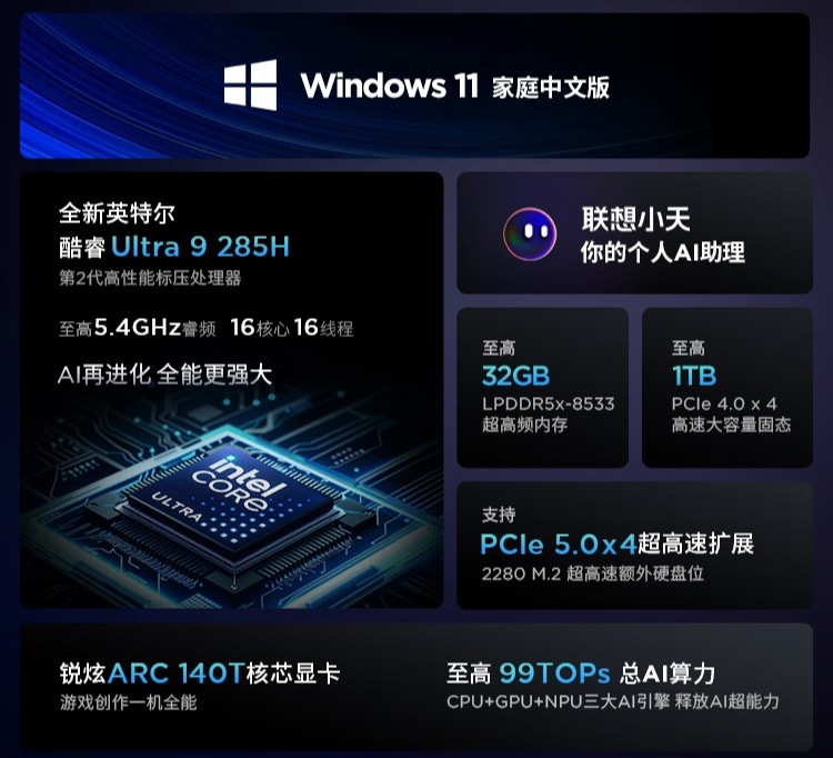 小新 Pro 14/16 GT AI 元启版均提供英特尔酷睿 Ultra 5 225H 和 Ultra 9 285H 版本可选,均为 32GB LPDDR5x 8533 内存 + 1TB PCIe 4.0 固态硬盘。