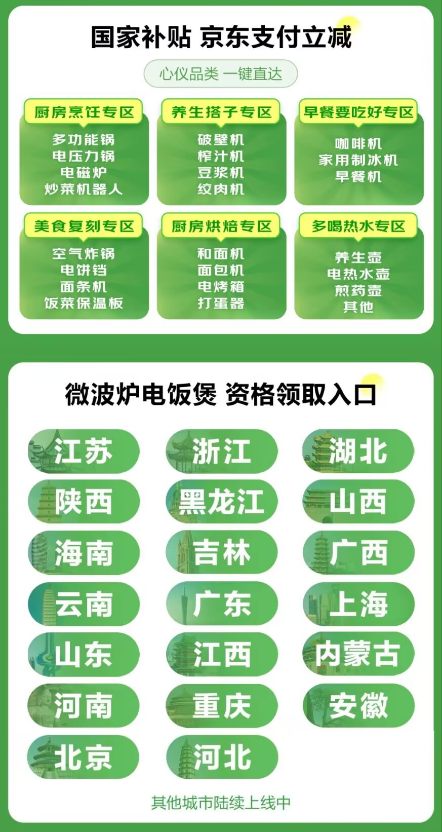 补贴品类包含:划船机、呼吸机、美容仪、面包机、咖啡机、剃须刀、血压计、影像设备、破壁料理机、跑步机、马桶、电动牙刷、投影机、制氧机、智能花洒、血糖仪、干衣机、吸尘器、垃圾处理器、饮水机、音箱音响、微蒸烤、蓝牙耳机、移动电源、电烤箱、挂烫机、浴室柜、护理床垫、空气净化器、洗地机、电吹风、浴霸、冲牙器、电磁炉、消毒柜、卷 / 直发器、热菜板、智能门锁、雾化器、除螨仪、血氧仪等。