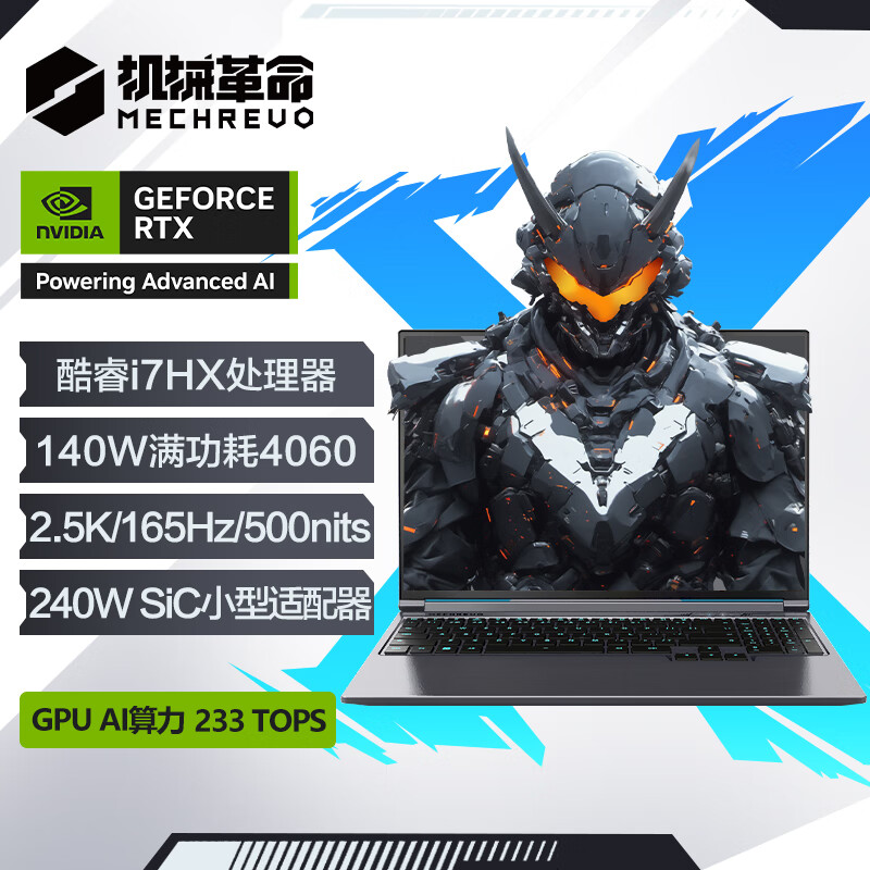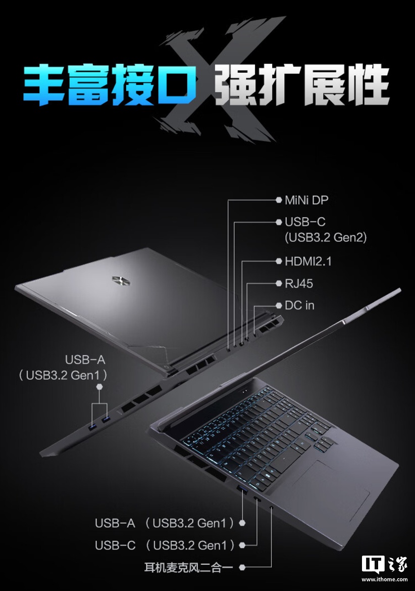 机械革命极光 X 游戏本采用了新一代高等级模具,A 面为阳极氧化喷砂铝合金,高光 CNC 工艺 LOGO,整机重约 2.2kg,厚约 21mm,还配备全区 RGB 可调键盘。