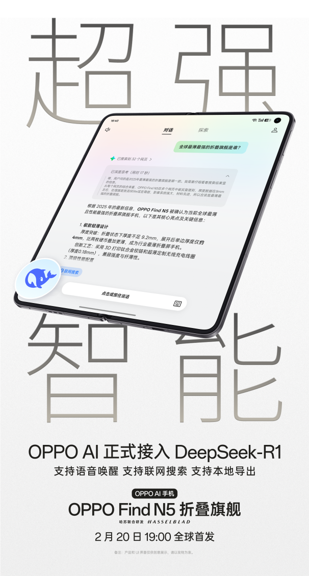 凭借新一代 3nm 制程工艺与全新架构,骁龙 8 至尊版的单核和 GPU 性能提升均超过 40%,使得 Find N5 可轻松应对多任务处理和 AI 场景。此外,OPPO AI 也将正式接入 DeepSeek-R1,Find N5 成为 OPPO 首批适配 DeepSeek-R1 的机型,用户通过小布助手即可语音唤醒 DeepSeek,Find N5 也为 DeepSeek-R1 带来了联网搜索的能力,帮助实时获取热点新闻及解读;并支持将生成结果导出为本地文件,方便用户留存和使用。