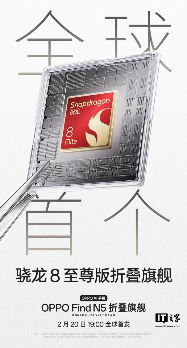 IT之家 2 月 11 日消息,OPPO 今日宣布“全球最薄的折叠旗舰”Find N5 将搭载骁龙8 至尊版移动计算平台,成为全球首款搭载这一最新旗舰平台的折叠屏手机。同时,Find N5 还将配备 OPPO 新一代自研冰川电池,带来行业领先的续航体验。