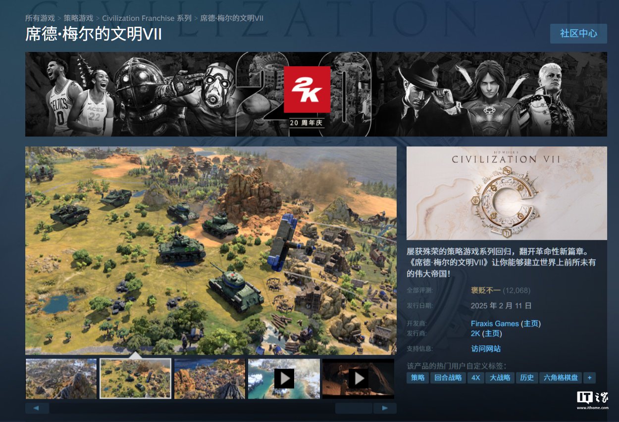IT之家 2 月 11 日消息,由 Firaxis Games 和 2K 所带来的策略游戏《席德・梅尔的文明 VII(Sid Meier's Civilization VII,文明 7)》现已正式发售,登陆 PlayStation、Xbox、Switch、PC 平台,Steam 国区定价 298 元,豪华版 428 元,创始人版本 558 元。
