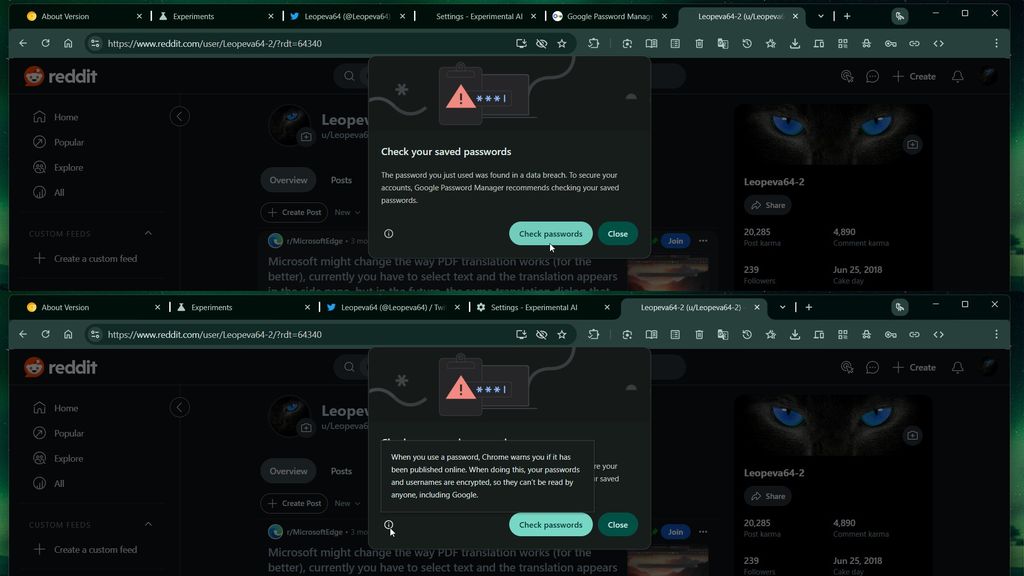 目前的 Chrome 浏览器会在检测到密码泄露时发出警告,并询问用户是否要更改密码,同时提供生成更强新密码的选项。最新的 Canary 功能似乎通过 AI 的帮助进一步增强和简化了这一流程。