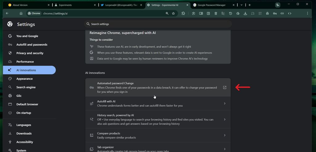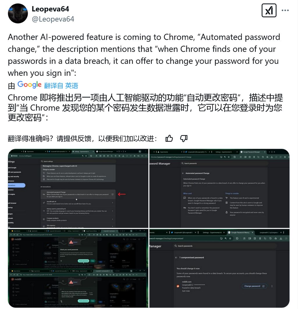 IT之家 2 月 11 日消息,消息源 Leopeva64 昨日(2 月 10 日)在 X 平台发布推文,曝料称在 Canary 频道最新 Chrome 浏览器中,谷歌正测试一项 AI 自动更改泄露密码功能。
