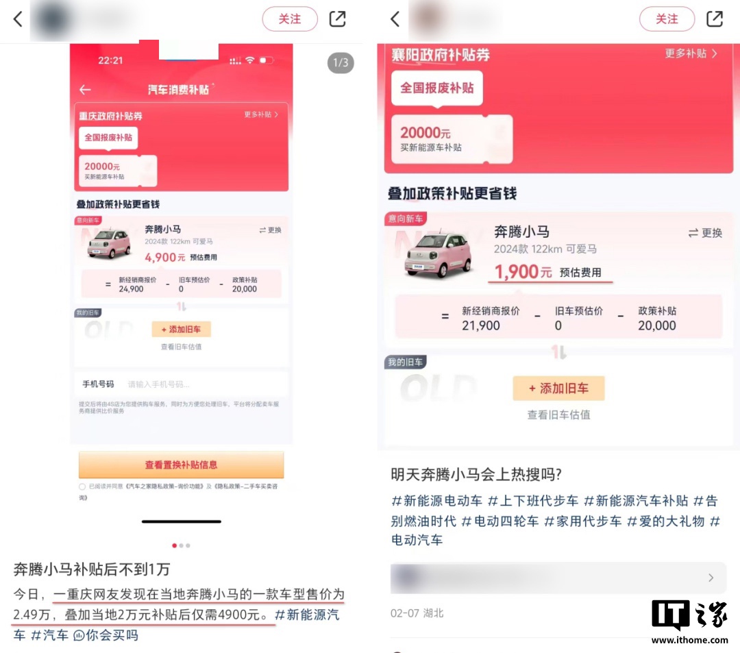 IT之家参考网传截图获悉,以重庆市为例,奔腾小马 2024 款 122km 可爱马车型当地经销商报价称 2.49 万元起,在叠加政府“全国报废补贴”后,到手价 4900 元;同款车型在湖北襄阳经销商报价称 2.19 万元,在叠加补贴后,到手价为 1900 元。