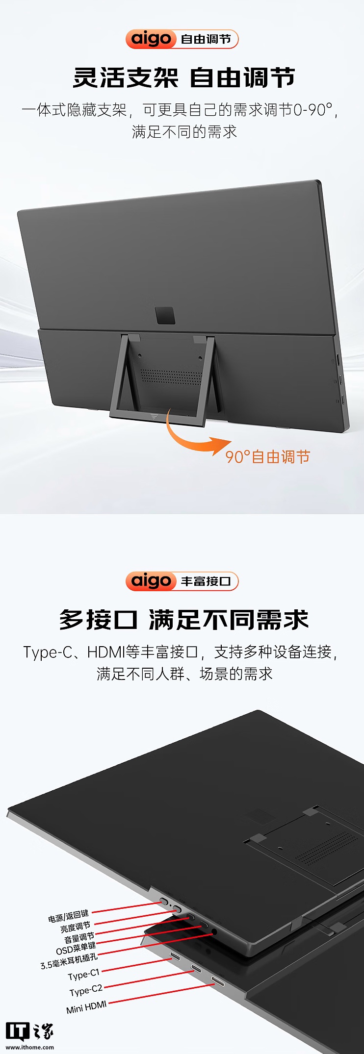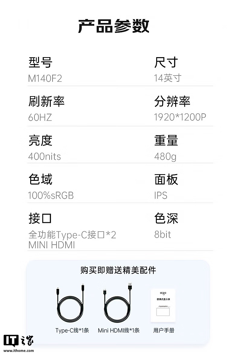 该机整体重量 480 克,配有 U 形支架,显示器配备 2 个全功能 USB-C 接口和 1 个 Mini HDMI 接口。