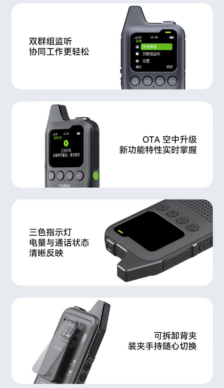 努比亚公网对讲机 M1 搭载 2W 扬声器、配有 1.77 英寸彩屏,可设置不同群组,支持语音回放。对讲机 M1 机身重量 134g,可搭配多款耳机使用,配有可拆卸背夹,支持系统 OTA 升级。