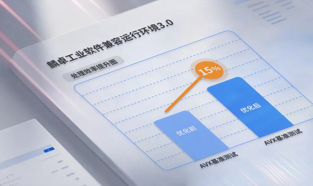 工业软件中广泛使用 AVX 指令以提升计算性能和数据处理能力。麟卓工业软件兼容运行环境 3.0 通过进一步优化 AVX 指令模拟执行的性能,提升了对 256/512 位宽数据的处理效率,AVX 基准测试中性能提升约 15%。
