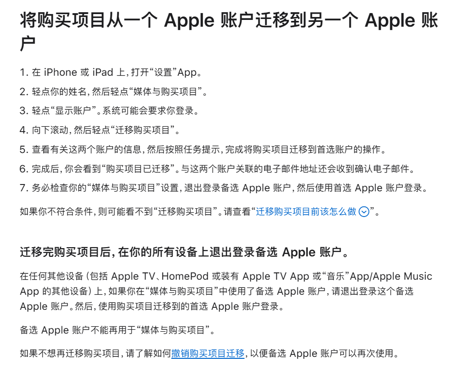 苹果说明,迁移购买内容需要提供两个账户的主要电子邮件地址、电话号码和密码,同时要求这两个账户未与他人共享,并且已开启双重认证。