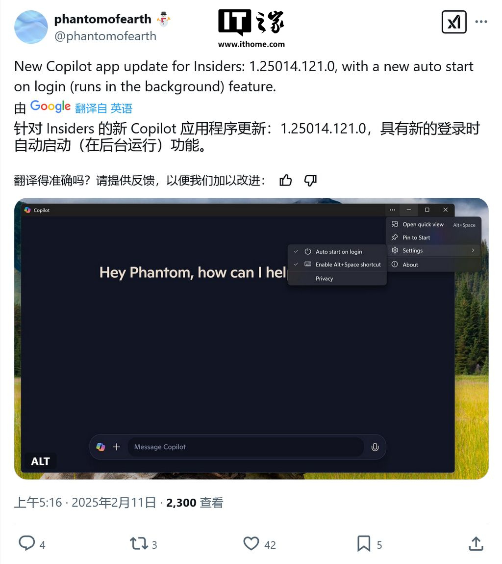 IT之家 2 月 12 日消息,消息源 @phantomofearth 昨日(2 月 11 日)发布博文,微软正推动 Windows 11 系统深度整合 Copilot,Windows Insider 项目成员安装最新 1.25014.121.0 版本后,可以看到新增的“登录后自动启动”功能。
