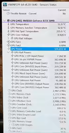 需要指出的是,测试显卡的功耗墙被调整,HWiNFO 显示拷机时 GPU 功耗为 574W,不完全代表普通用户的实际情况。