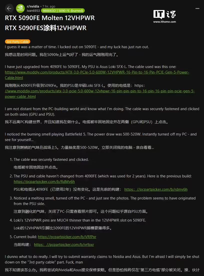 据IT之家 2 月 10 日报道,Reddit 用户 ivan6953 遭遇了英伟达 RTX 5090 FE 显卡的电源连接器插座和连接线熔化的故障,其使用的 Moddiy 品牌第三方电源线显得非常可疑。