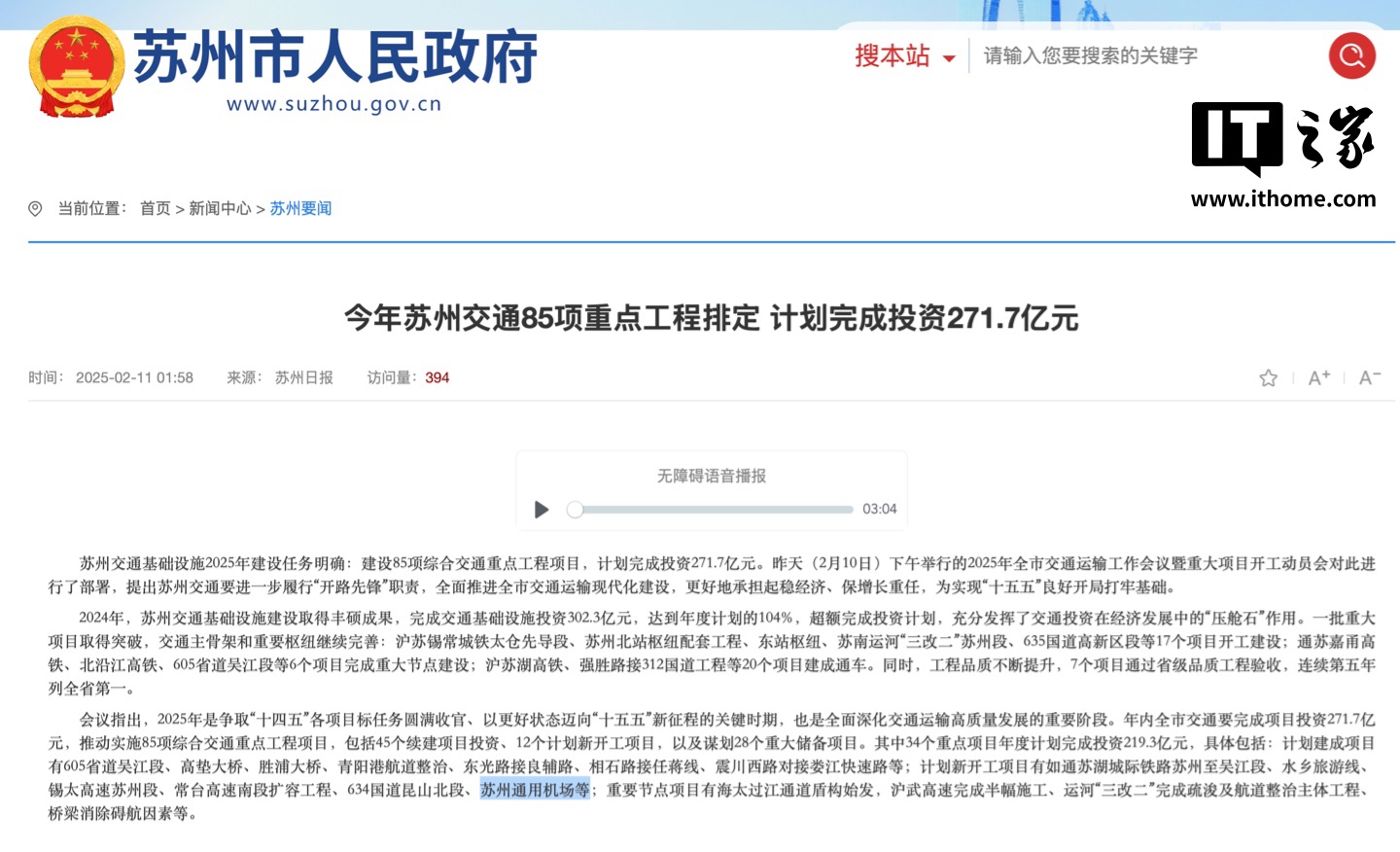 IT之家 2 月 12 日消息,据苏州市人民政府发文,苏州全市交通运输工作会议暨重大项目开工动员会于 2 月 10 日召开,会议中明确苏州将在今年要建设 85 项综合交通重点工程项目,计划完成投资 271.7 亿元。其中提到,苏州通用机场将于今年新开工。