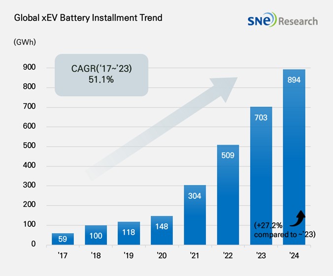 数据显示,2024 年全球注册的新能源汽车(EV、PHEV、HEV)动力电池总装车量达 894.4GWh,同比增长 27.2%。