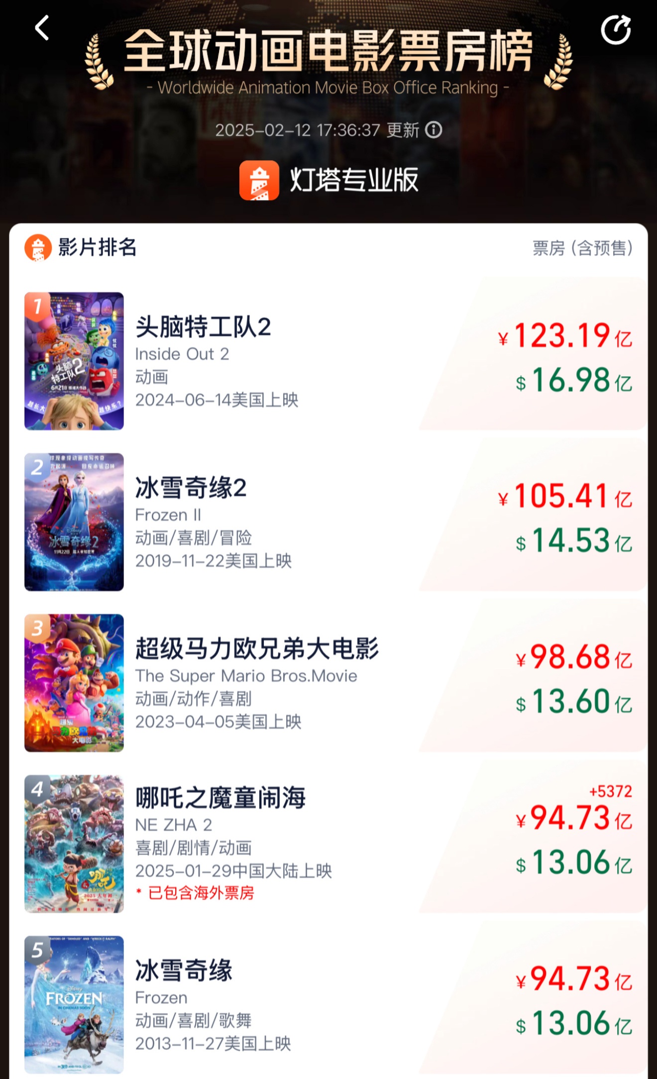 IT之家 2 月 12 日消息,据灯塔专业版,截至 2 月 12 日 17 时 36 分,影片《哪吒之魔童闹海》总票房(含预售)突破 13.06 亿美元(含海外点映票房 37.0 万美元),超过《冰雪奇缘》,进入全球动画电影票房榜前 4 名,也是全球动画电影票房 TOP4 唯一非好莱坞影片。