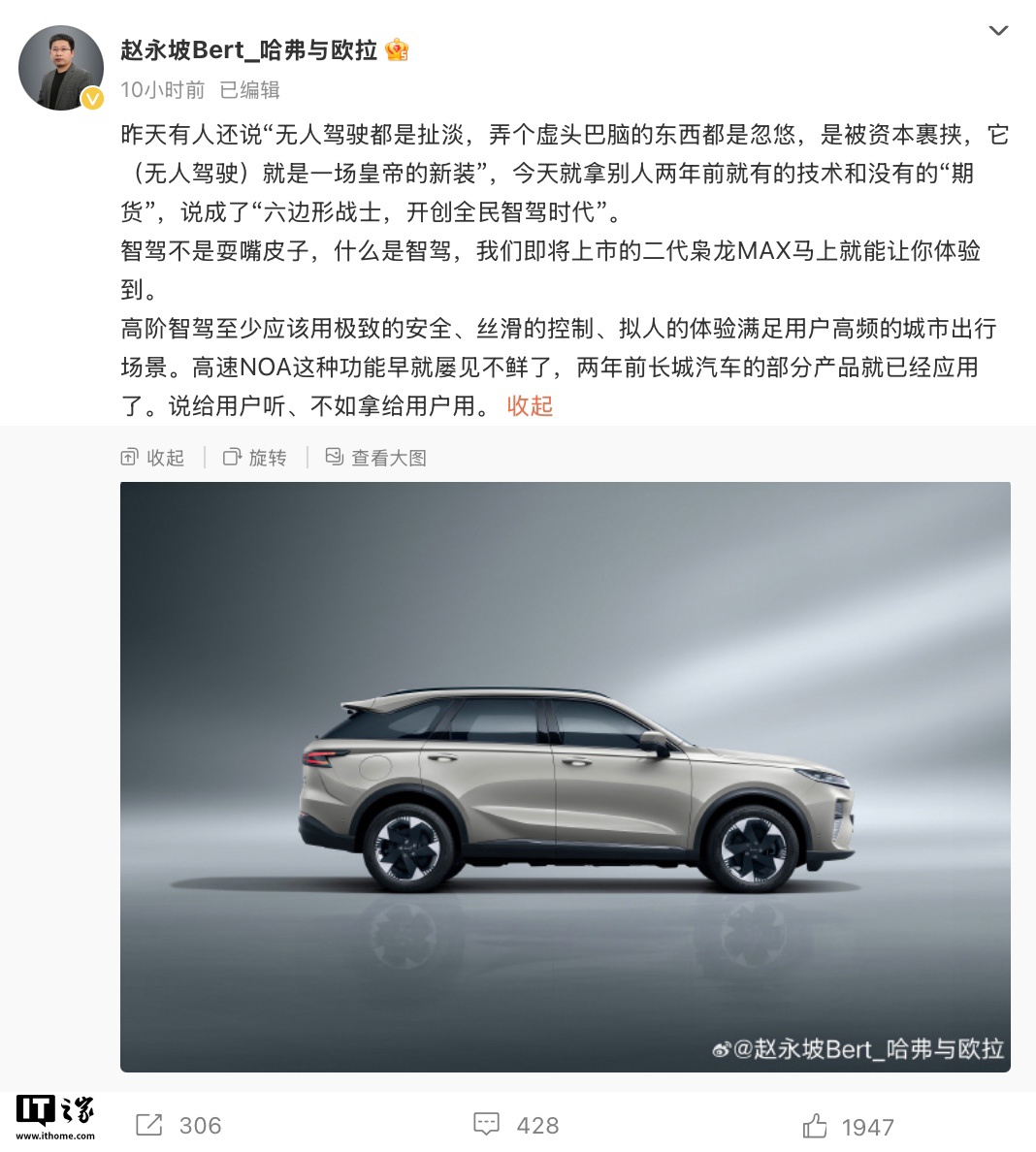 IT之家 2 月 12 日消息,哈弗与欧拉品牌总经理赵永坡现已在微博公布了一张哈弗二代枭龙 MAX 混动 SUV 的官图,并表示该车将支持高阶智驾功能。作为比较,当前在售的现款枭龙 MAX 官方指导价为 15.98 万-17.98 万元。