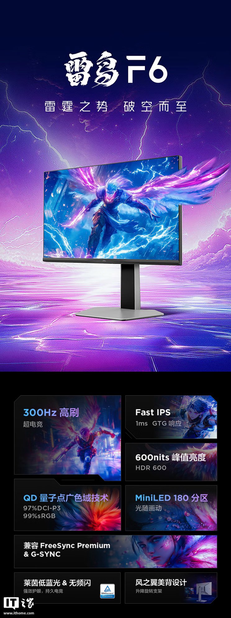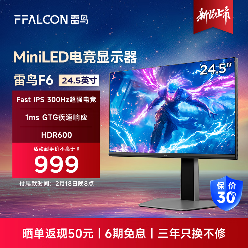 IT之家 2 月 12 日消息,雷鸟现已在京东上架一款型号为 F6 的 24.5 英寸显示器(具体 SKU 为 R25Q61),这款显示器主打“1080P 原生 300Hz”,将于 2 月 18 日 19:30 首销,首发价为 999 元。