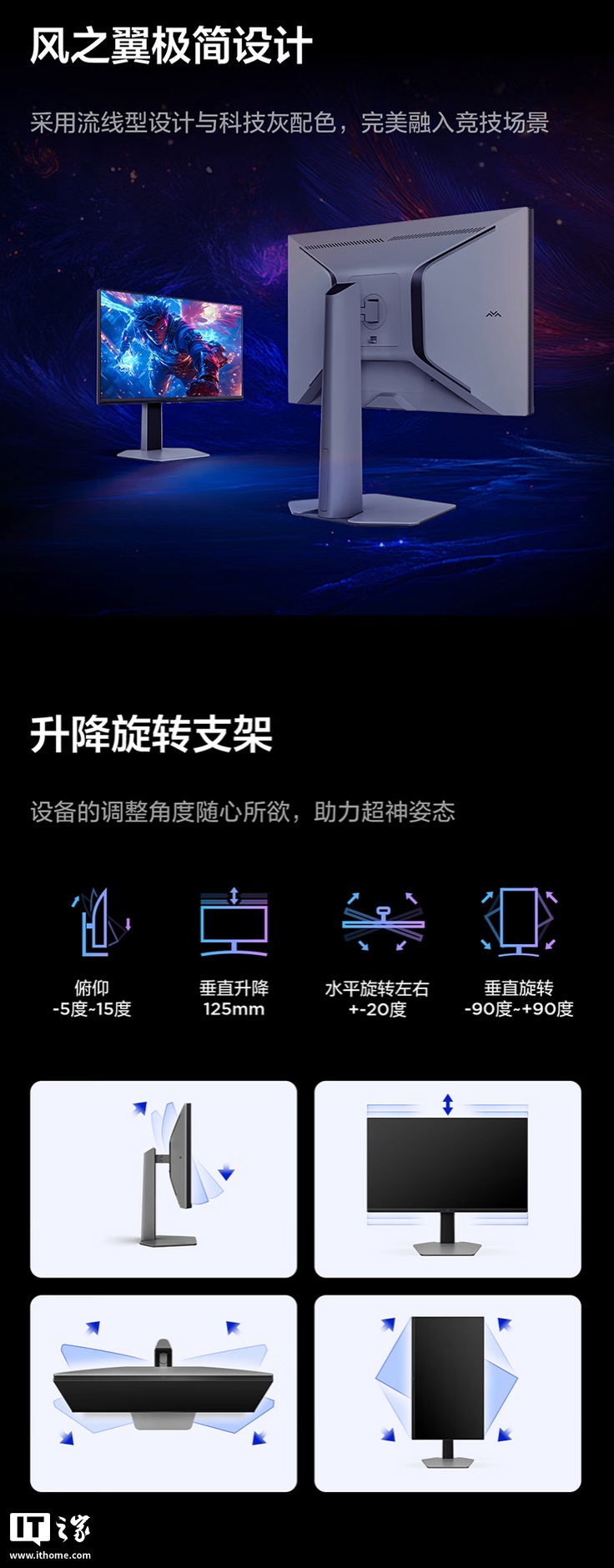 这款显示器支架支持升降 / 倾斜 / 旋转,显示器本体提供 2 个 HDMI(规格未公布)接口、1 个 DP 1.4、1 个 3.5mm 音频接口。