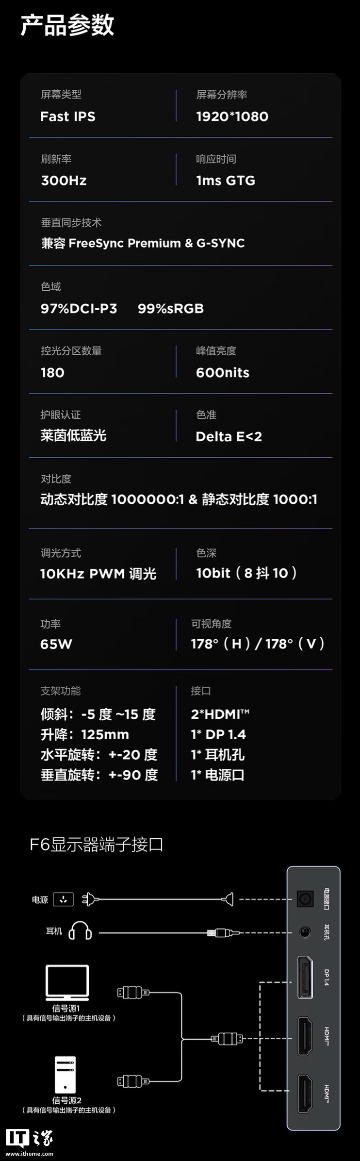 这款显示器配备 1920x1080 分辨率原生 300Hz Fast IPS 面板,拥有 180 分区,峰值亮度 600 尼特,静态对比度 1000:1,GtG 响应速度 1ms,显示器支持 10-Bit 色彩(8-Bit + FRC),覆盖 97% DCI-P3 和 99% sRGB 色域。