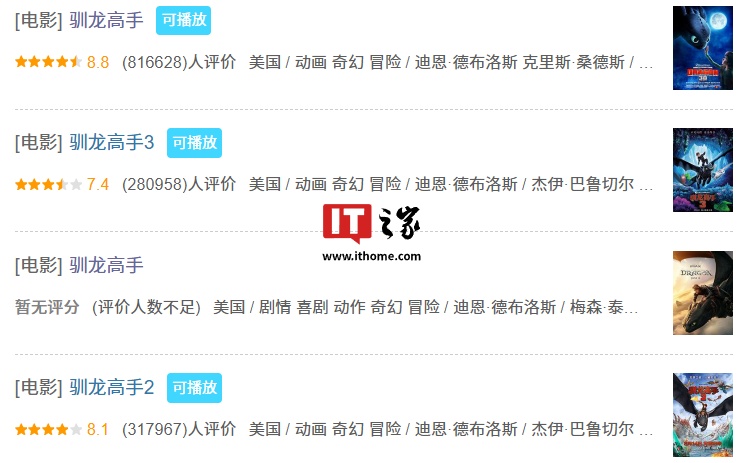 目前,《驯龙高手》系列作品已推出 3 部电影,豆瓣评分依次为 8.8、8.1 和 7.4(按照影片推出顺序排列)。