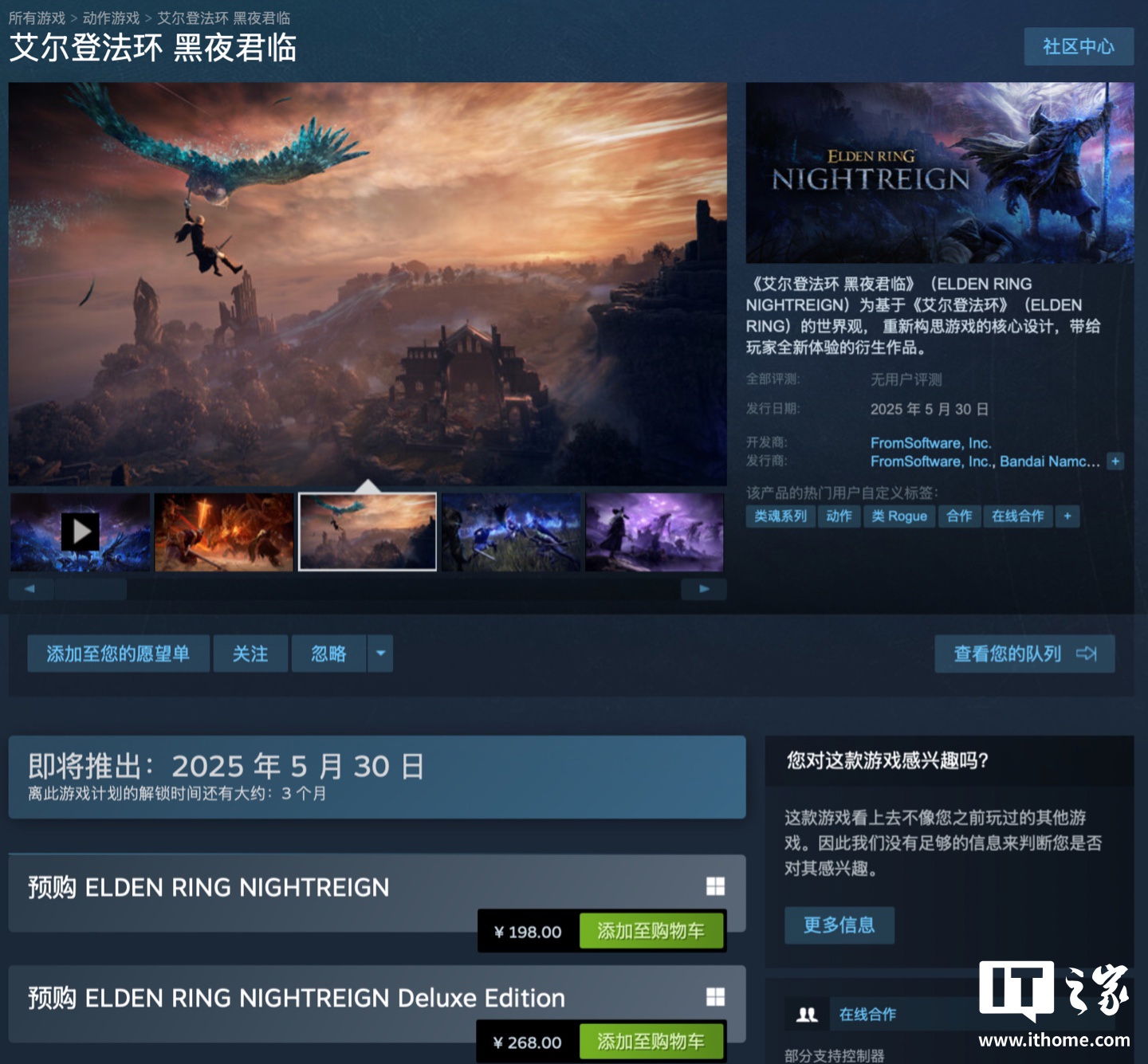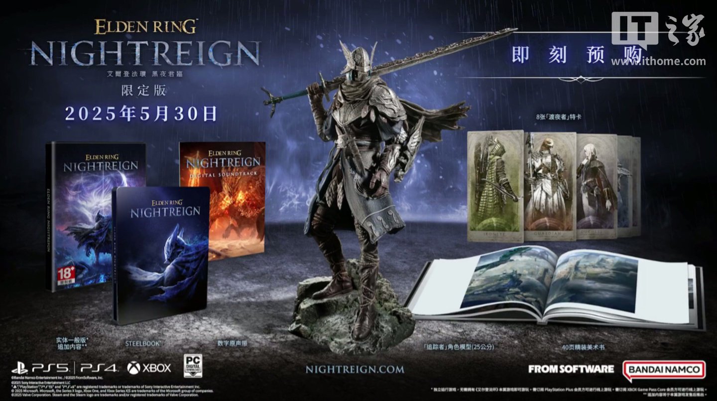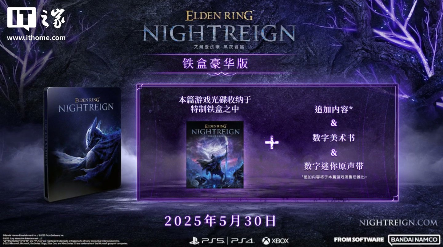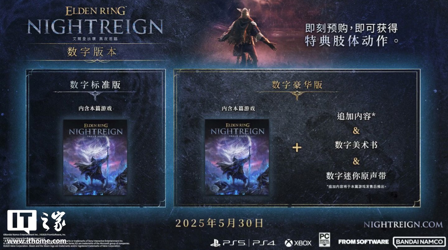 IT之家 2 月 12 日消息,万代宣布旗下《艾尔登法环:黑夜君临(Elden Ring:Nightreign)》将于 5 月 30 日发售,目前这款游戏已上架 Steam,国区标准版 198 元,豪华版 268 元,IT之家附游戏商品页如下。