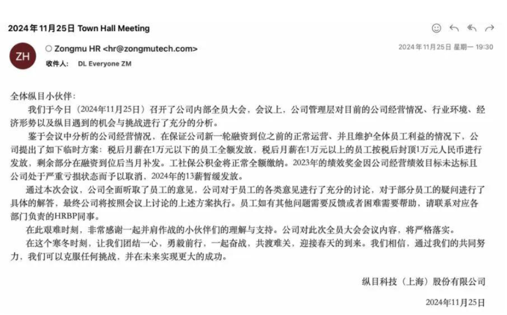 事实上,纵目科技今日的局面,此前便已显露苗头。据内部员工透露,每月 10 日是工资发放日,在去年 11 月 10 日,公司忽然宣称发薪日延期至 25 日。到了 11 月 25 日当天,公司再次发布通知,“无法发放全薪,公司将为员工正常缴纳社保公积金,但税后月薪按封顶 1 万元发放,且 2023 年绩效奖金取消。”