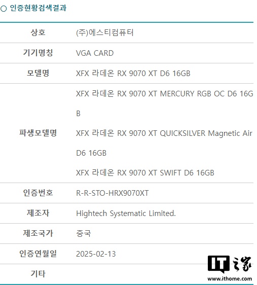 IT之家 2 月 13 日消息,@harukaze5719 发现今日有多款 RX 9070 系列显卡通过了韩国 RRA 认证,预计将于近期发布上市。