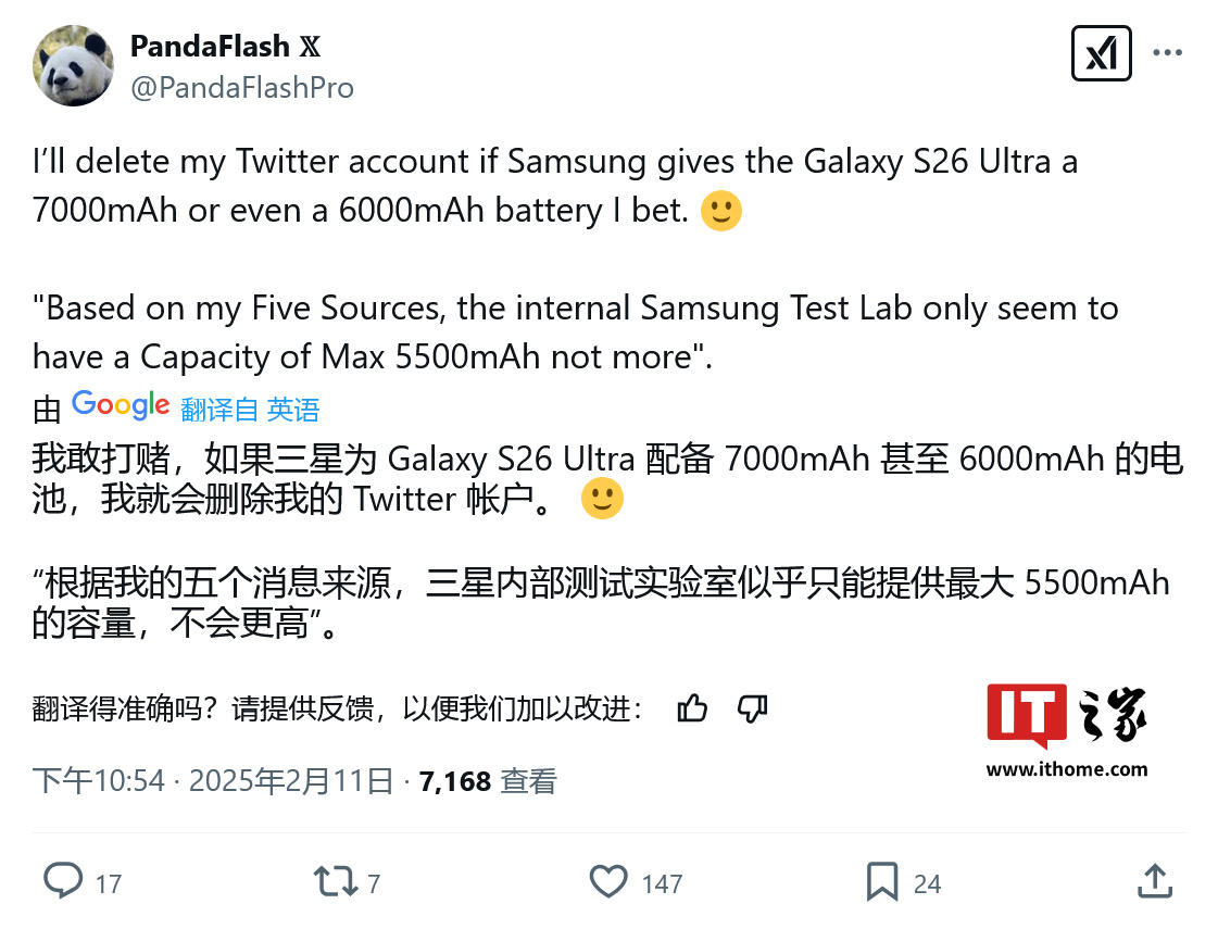IT之家 2 月 14 日消息,消息源 PandaFlash 于 2 月 12 日在 X 平台发布系列推文,曝料称三星 Galaxy S26 Ultra 手机电池容量最高 5500mAh,且在未来 2~3 年内不会装备屏下摄像头。