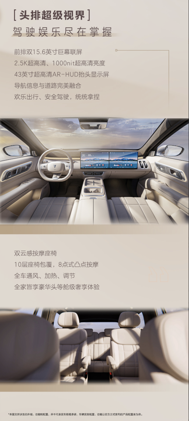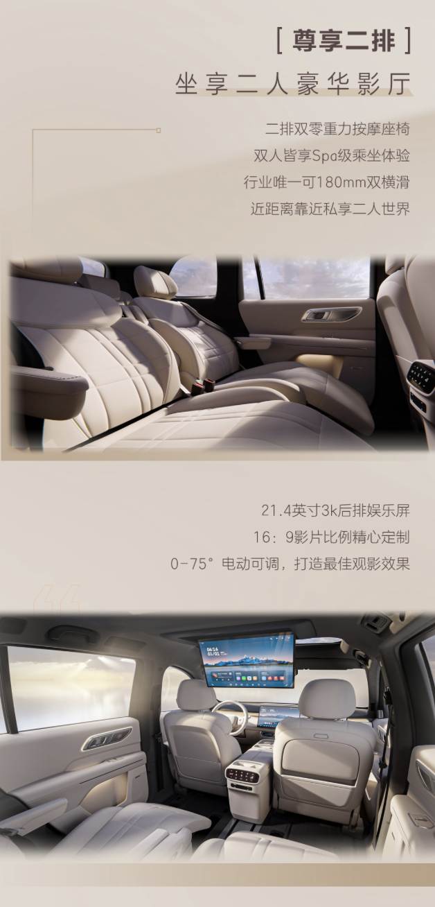 该车第二排配备 21.4 英寸 3K 后排娱乐屏,为双独立式座椅,每张座椅均带有独立式扶手并支持座椅按摩 / 通风 / 加热,扶手内侧设计有座椅多功能控制按键,支持 180 毫米横向滑动调节,车辆同时配备独立空调控制面板。