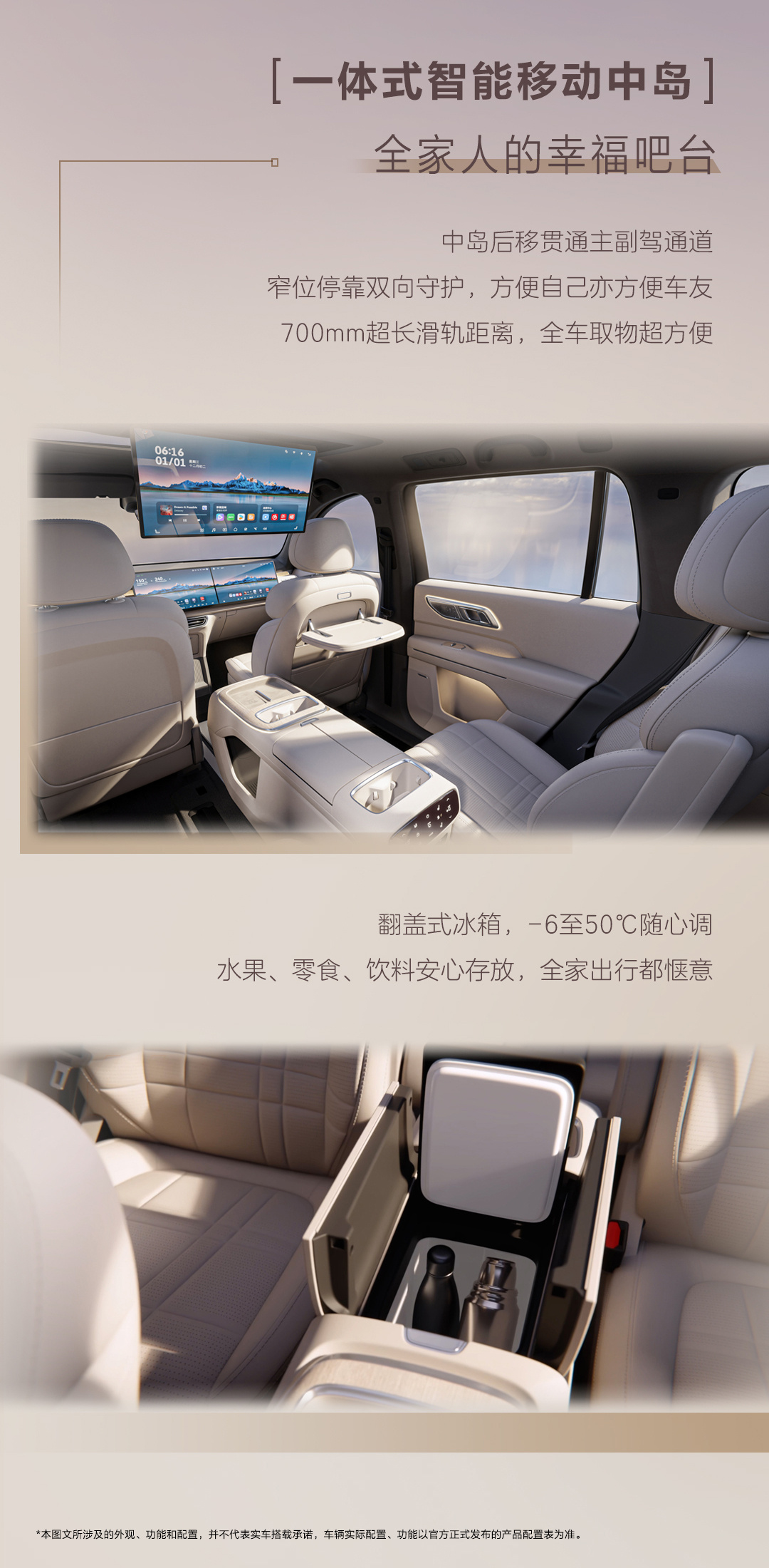 此外,该车配备可在第一排和第二排之间进行移动的中岛(带有 700 毫米滑轨),该中岛前部设计有手机无线充电处,充电面板下方为隐藏式储物空间,并且该中岛前部和后部均配有杯架,中岛中部为车载冰箱,此前深蓝汽车透露该车载冰箱容积为 10 升,温控范围在零下 6 摄氏度至 50 摄氏度。