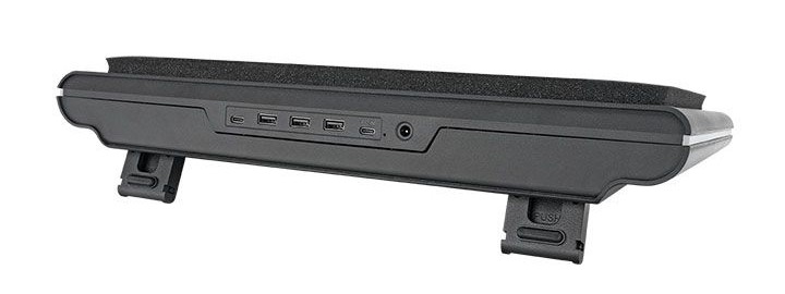 这一笔记本散热器同样也是一款 USB 集线器产品:其尾部可拓展出 1 个 USB-C 10Gbps 和 3 个 USB 2.0 Type-A。