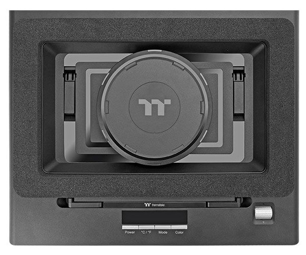 该散热器的正面下沿部分设有数显面板,可实时显示内置传感器所探测到的温度和风扇当前转速。用户可通过右侧滚轮调整转速,也可在中间按键中开启 / 关闭设备、切换温度单位,并对灯效进行控制。
