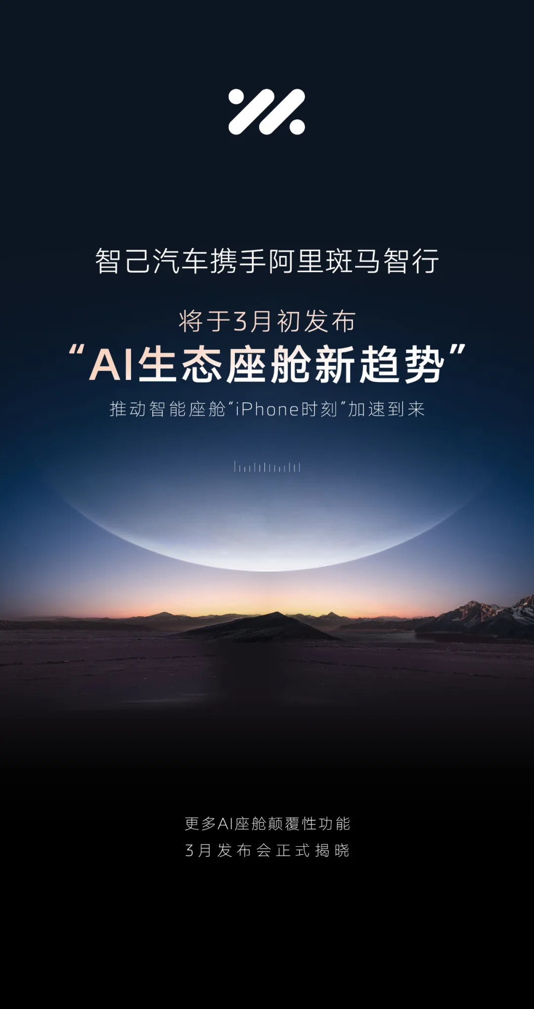 IT之家 2 月 14 日消息,智己汽车今日宣布,将于 3 月初携手阿里斑马智行发布“AI 生态座舱新趋势”,更是喊出了“推动智能座舱‘iPhone 时刻’加速到来”的 slogan。