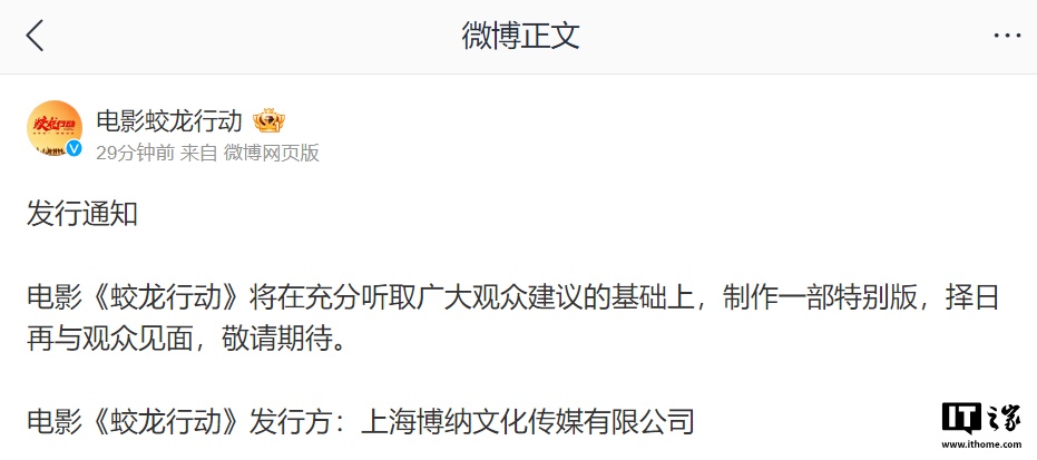 IT之家 2 月 14 日消息,电影《蛟龙行动》今日公布发行通知,将在充分听取广大观众建议的基础上,制作一部特别版,择日再与观众见面。