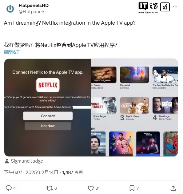 IT之家 2 月 15 日消息,科技媒体 The Verge 今天(2 月 15 日)发布博文,报道称网飞(Netflix)澄清,Netflix 内容出现在 Apple TV 新界面位置是一个错误,Netflix 并未扩展 Apple TV 功能。