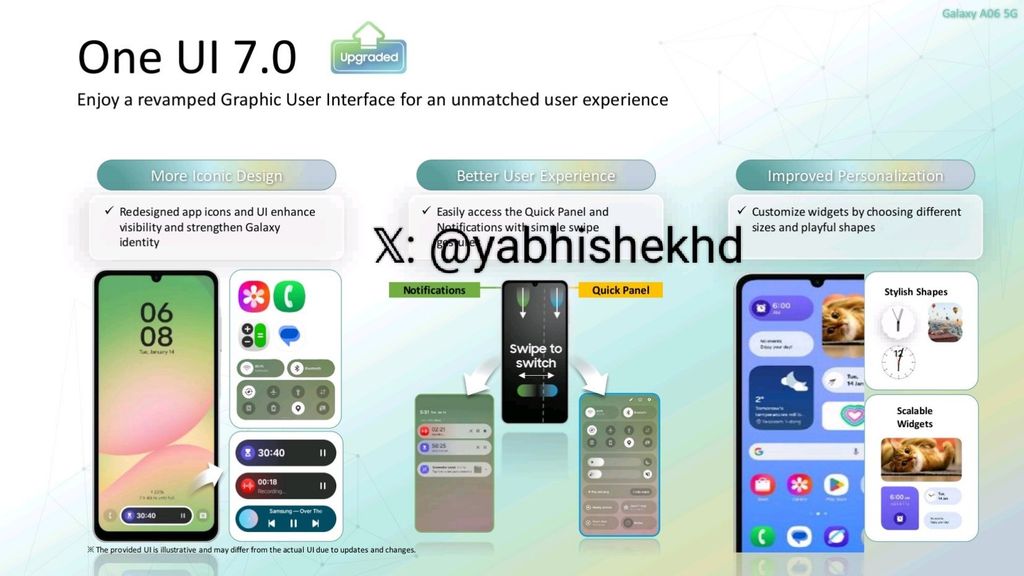 IT之家 2 月 15 日消息,消息源 @yabhishekhd 昨日(2 月 14 日)在 X 平台发布推文,分享了三星 Galaxy A06 5G 手机的内部培训资料,显示该机主打 One UI 7.0 更新,具备更强的 5G 连接能力以及更佳的拍照体验。