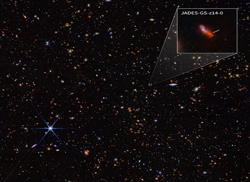 JADES-GS-z14-0 星系,拍摄于詹姆斯・韦布空间望远镜,它打破了已知最遥远星系的记录,形成于大爆炸发生后的 2.9 亿年。图片来源:美国国家航空航天局、欧洲航天局、加拿大航天局、空间望远镜科学研究所、布兰特・罗伯逊(加州大学圣克鲁兹分校)、布赖恩・约翰逊(哈佛 - 史密松天体物理中心)、斯特凡诺・塔切拉(剑桥大学)、帕特里克・卡吉尔(哈佛 - 史密松天体物理中心)