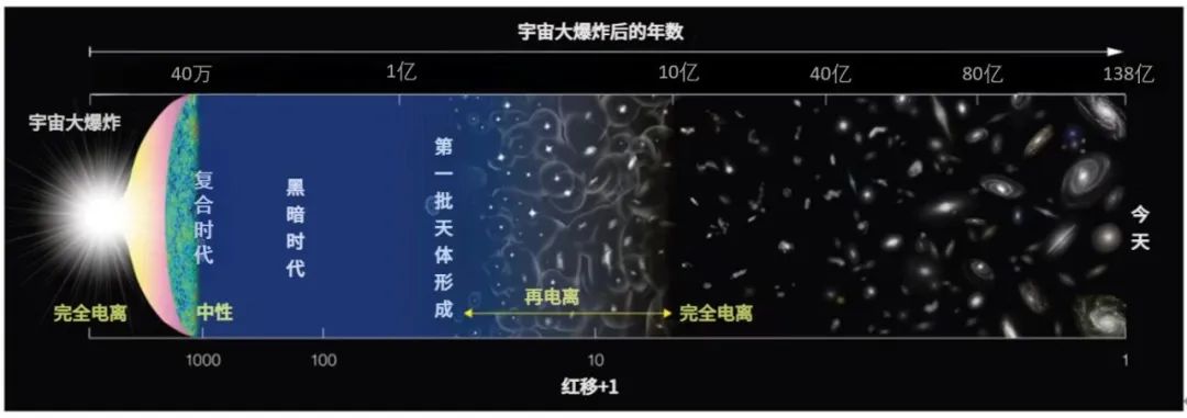 宇宙发展历程:大爆炸产生了一群炽热且电离的亚原子粒子(结构比原子更小的粒子)团。几十万年后,中性原子开始形成于“复合”过程中。紧接着,宇宙迎来了“黑暗时代”,整个宇宙都充斥着中性氢。然而,在大爆炸发生 1 亿多年后的某个时刻,第一批恒星点亮了宇宙的黎明,它们的光芒从氢气中“拽”出电子,宇宙也由此逐渐重新电离。图片来源:日本国立天文台