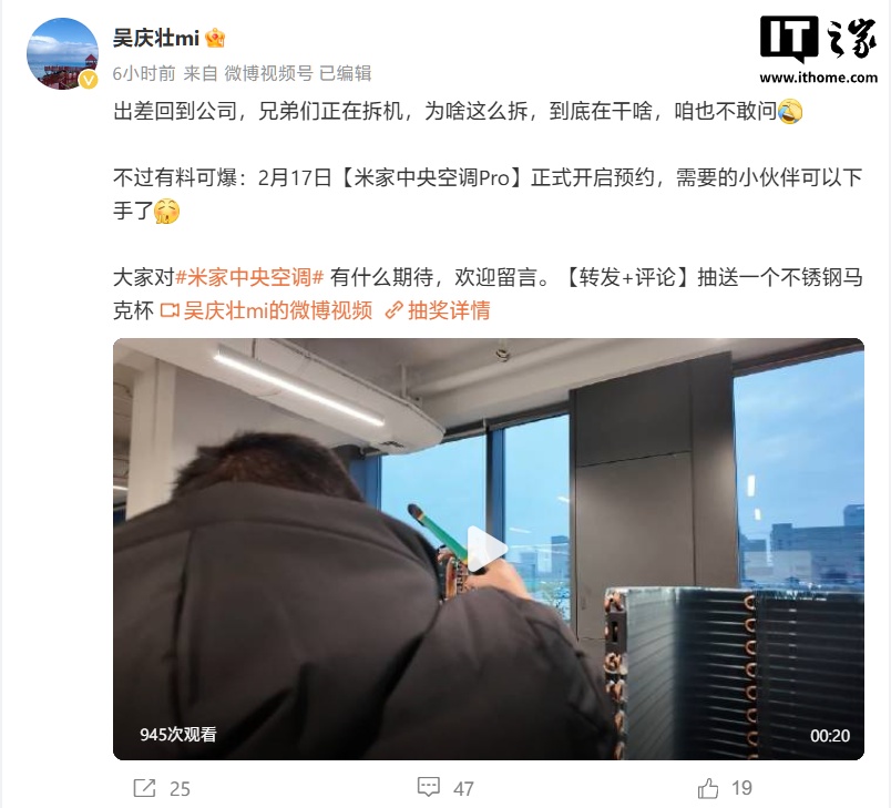 IT之家 2 月 15 日消息,小米集团大家电部家中空调研发负责人吴庆壮今日在微博透露:2 月 17 日米家中央空调 Pro 正式开启预约。