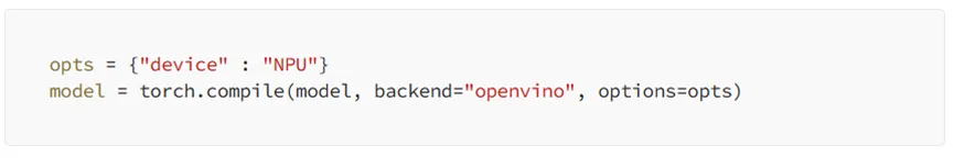 此外,2025.0 版本首次实现 NPU 加速支持,开发者可通过 PyTorch 的 torch.compile 接口调用英特尔 NPU 算力。OpenVINO 已经在 CPU 和 GPU 上得到支持,并且在性能方面非常接近原生 OpenVINO 推理。如下为启用方式: