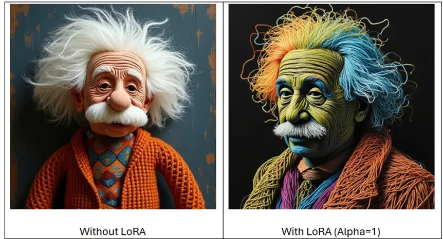 例如,INT8 量化版 FLUX.1-dev 模型在应用 Yarn 风格 LoRA 前后的对比如下(提示词:"albert einstein, yarn art style",初始种子 = 420,迭代次数 = 20):