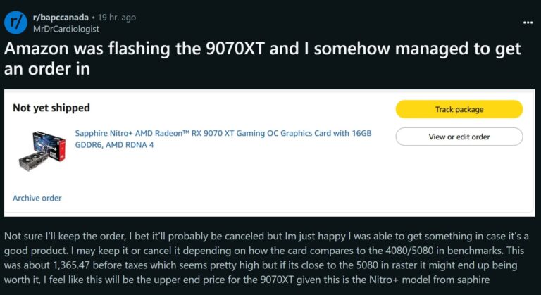 AMD 曾表示,RX 9070 XT 的定价不会达到 899 美元(当前约 6532 元人民币),所以这款显卡很显然价格偏高。目前已经有一位消费者下单购买,预计该订单将在 3 月 10 日左右发货。