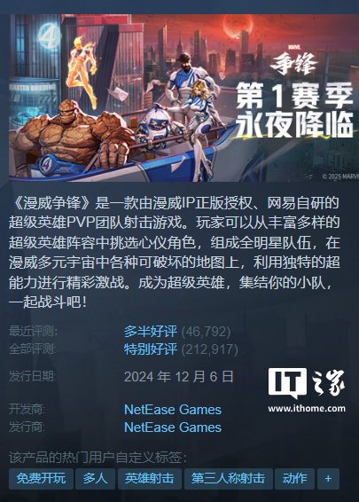 IT之家 2 月 16 日消息,网易旗下《漫威争锋》于 2024 年 12 月 6 日发售,是一款由漫威 IP 正版授权、网易自研的超级英雄 PVP 团队射击游戏。