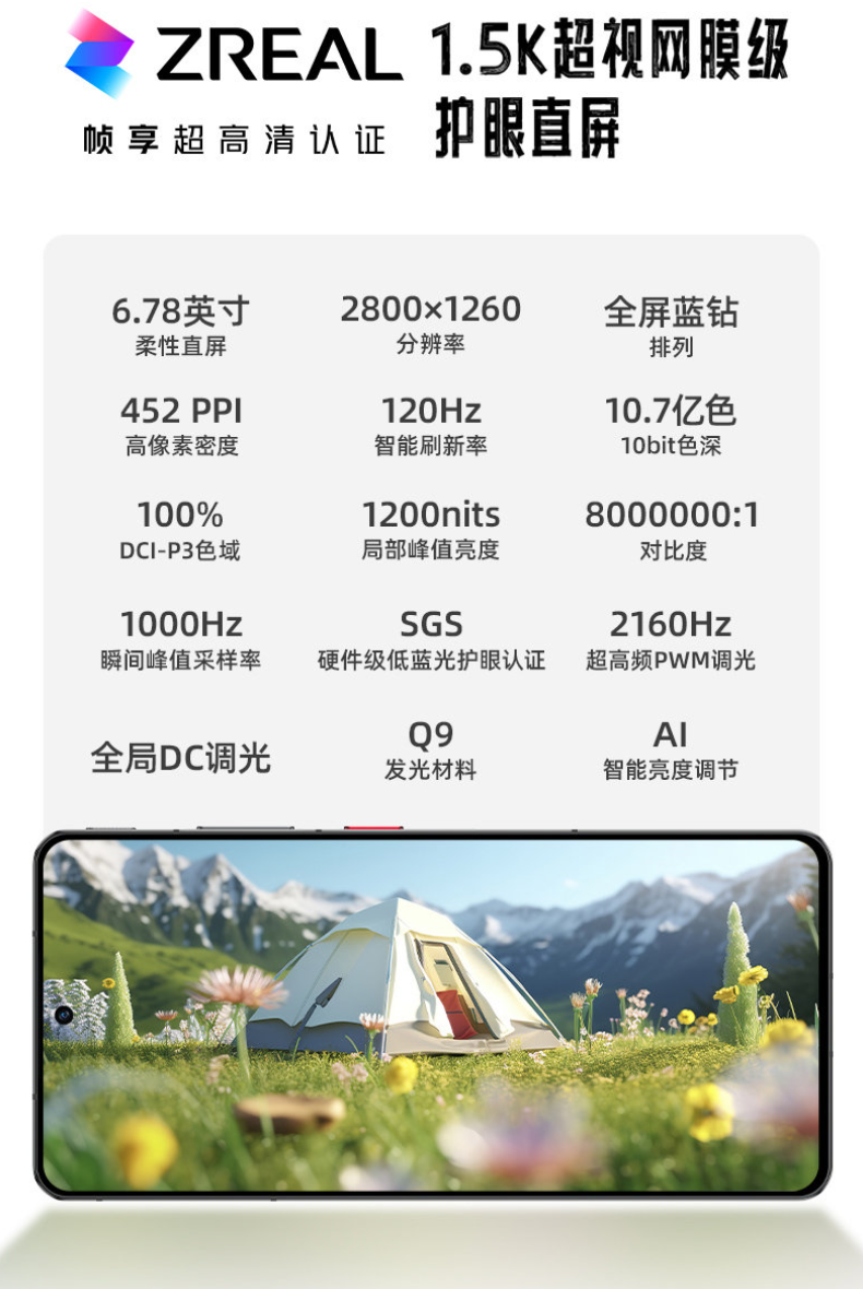 该手机配备 6.78 英寸京东方 OLED 超视网膜级柔性护眼直屏,分辨率 2800×1260,支持 120Hz 刷新率、1000Hz 瞬时触控采样率、2160Hz PWM 高频调光、10bit 色深、100% DCI-P3 色域,局部峰值亮度 1200nits,支持全局 DC 调光,覆盖龙犀玻璃。
