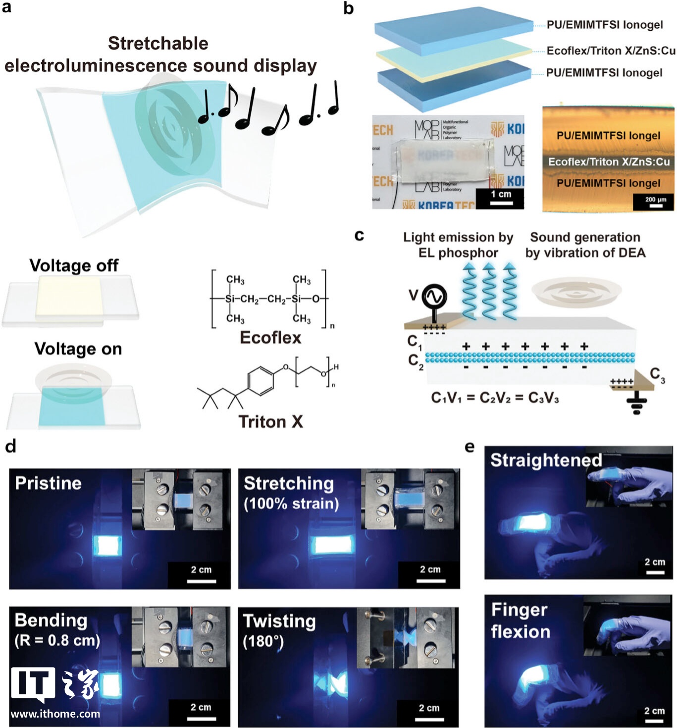 据IT之家了解,该研究已发表于《先进功能材料》杂志,这种可拉伸的电致发光(EL)声光显示装置解决了现有 EL 显示屏拉伸性有限和亮度不足的问题。其中,Triton X 能够更有效地储存电能,并使材料更具拉伸性。当电流通过这种复合材料时,磷光体颗粒会发光,同时产生微小的振动,从而发出声波。