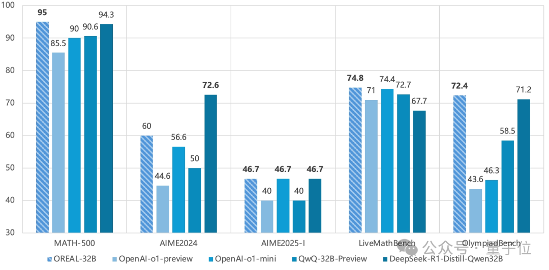 从 Qwen2.5-32B-Base 模型出发,仅通过微调和基于结果反馈的强化学习,在不蒸馏超大模型如 DeepSeek-R1 的情况下,就能超越 DeepSeek-R1-Distill-Qwen32B 和 OpenAI-O1 系列的超强数学推理性能。