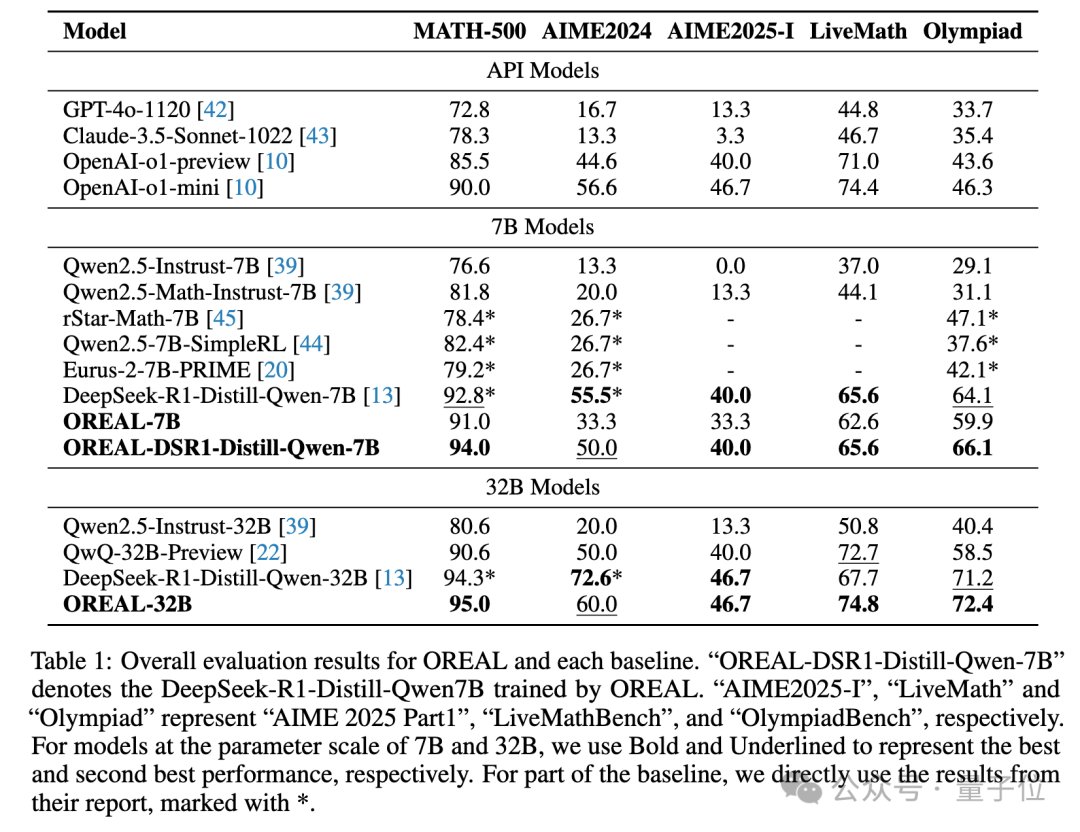 此外,将 Oreal 应用于此前最佳的 7B 模型(DeepSeek-r1-Distill-Qwen-7B)后,得到的新模型 OREAL-DSR1-Distill-Qwen-7B 在 MATH-500 上取得了 94.0 的 pass@1 精度,创下了 7B 模型的记录。千问的基座,经过 DeepSeek 的蒸馏训练,再经过上海 AI Lab 的强化学习训练,达到了中国原创新高度。