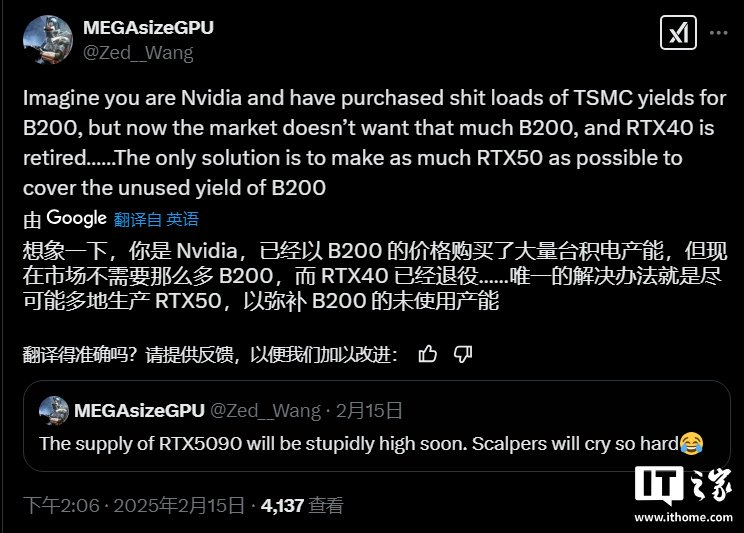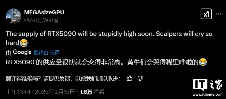 根据显卡爆料人 MEGAsizeGPU 昨日发布的消息,这一情况即将改变。爆料称 RTX 5090 的供应量很快会非常高,黄牛会哭得很惨。